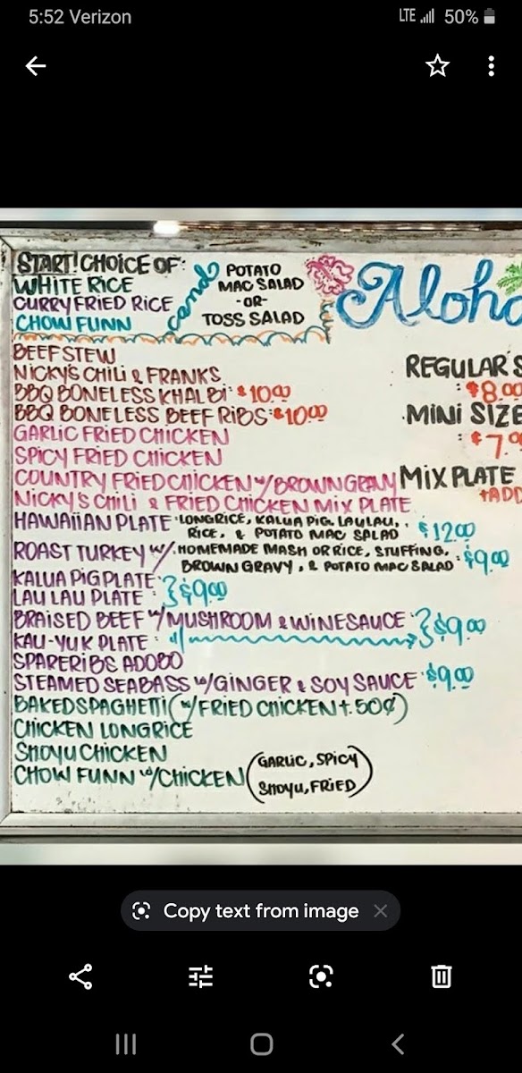 The Nickys Lunch Wagon Menu offers a delightful range of hearty, flavorful dishes that perfectly represent the comfort food of Hawaii. One of the standout items is the BBQ Boneless Khalbi, a tender and savory treat that’s sure to satisfy anyone craving a smoky, grilled dish. If you're in the mood for something a little more traditional, the Roast Turkey is a classic, with juicy, perfectly cooked meat paired with savory sides. For fans of corned beef, the Fresh Corned Beef with Cabbage delivers a rich, flavorful experience that's both comforting and filling.